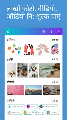 20 लाख से अधिक रॉयल्टी-फ़्री फ़ोटो, वीडियो, 25 हज़ार से ज़्यादा म्यूज़िक ट्रैक्स और सैंकड़ों फ़ॉन्ट वाली हमारी व्यापक कंटेंट लाइब्रेरी से डिज़ाइन को और आसान बनाएं। अपने डिज़ाइनों को फ़ोन या पोस्टर पर कैसे दिखेंगे, यह देखने के लिए स्मार्ट मॉकअप का उपयोग करें। और जो लोग डिज़ाइन में एक कदम आगे जाना चाहते हैं, उनके लिए Canva Pro प्रीमियम टेम्पलेट्स, वन-क्लिक बैकग्राउंड रिमूवल, मैजिक रीसाइज़ और ब्रांड किट जैसी उन्नत सुविधाएँ प्रदान करता है, जिससे आपके डिज़ाइन हमेशा विशिष्ट और सुसंगत रहें। व्यक्तिगत उपयोग से लेकर छोटे व्यवसायों, छात्रों और सोशल मीडिया प्रबंधकों तक, Canva हर किसी के लिए एक संपूर्ण ग्राफ़िक डिज़ाइन, फ़ोटो और वीडियो एडिटिंग का समाधान है।
