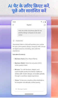 इस ऐप में Word, Excel, PowerPoint और स्वयं Copilot की शक्ति एक साथ मिलती है। अपने AI सहायक Copilot से सीधे प्रश्न पूछें और पेशेवर सामग्री तैयार करें। Word के साथ रिज्यूमे जैसे दस्तावेज़ों को विशेष टेम्पलेट्स का उपयोग करके लिखें और संपादित करें। PowerPoint के Presenter Coach जैसे टूल्स से अपनी प्रस्तुतियों का आत्मविश्वास से अभ्यास करें। Excel के स्प्रेडशीट टेम्पलेट्स के साथ अपने बजट और डेटा को व्यवस्थित रूप से प्रबंधित करें। रचनात्मकता को बढ़ावा देने के लिए, Microsoft Designer का उपयोग करके AI की मदद से कुछ ही सेकंड में आकर्षक डिज़ाइन बनाएँ और तस्वीरों को संपादित करें। Microsoft Corporation यह सुनिश्चित करता है कि आपके सभी आवश्यक उपकरण एक ही सुविधाजनक स्थान पर उपलब्ध हों।