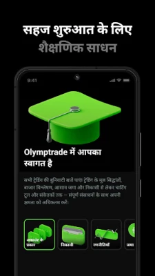 Olymptrade के साथ अपनी ट्रेडिंग यात्रा शुरू करना पूरी तरह से जोखिम-मुक्त है। प्रत्येक ट्रेडर को 10,000 डेमो मुद्रा इकाइयों के साथ एक निःशुल्क अभ्यास खाता मिलता है, जिससे आप वास्तविक बाजार स्थितियों में बिना किसी जोखिम के अभ्यास कर सकते हैं और अपनी रणनीतियों को निखार सकते हैं। आप किसी भी समय लाइव ट्रेडिंग में आसानी से स्विच कर सकते हैं। इसके अतिरिक्त, चाहे आप वित्तीय बाजारों में नए हों या एक अनुभवी पेशेवर, Olymptrade के पास आपके लिए व्यापक शैक्षिक संसाधन हैं। विशेषज्ञ वेबिनार, गहन पाठ्यक्रम, प्रभावी ट्रेडिंग रणनीतियाँ और नवीनतम बाज़ार विश्लेषण आपको सूचित निर्णय लेने और अपने वित्तीय लक्ष्यों को सफलतापूर्वक प्राप्त करने में मदद करते हैं।